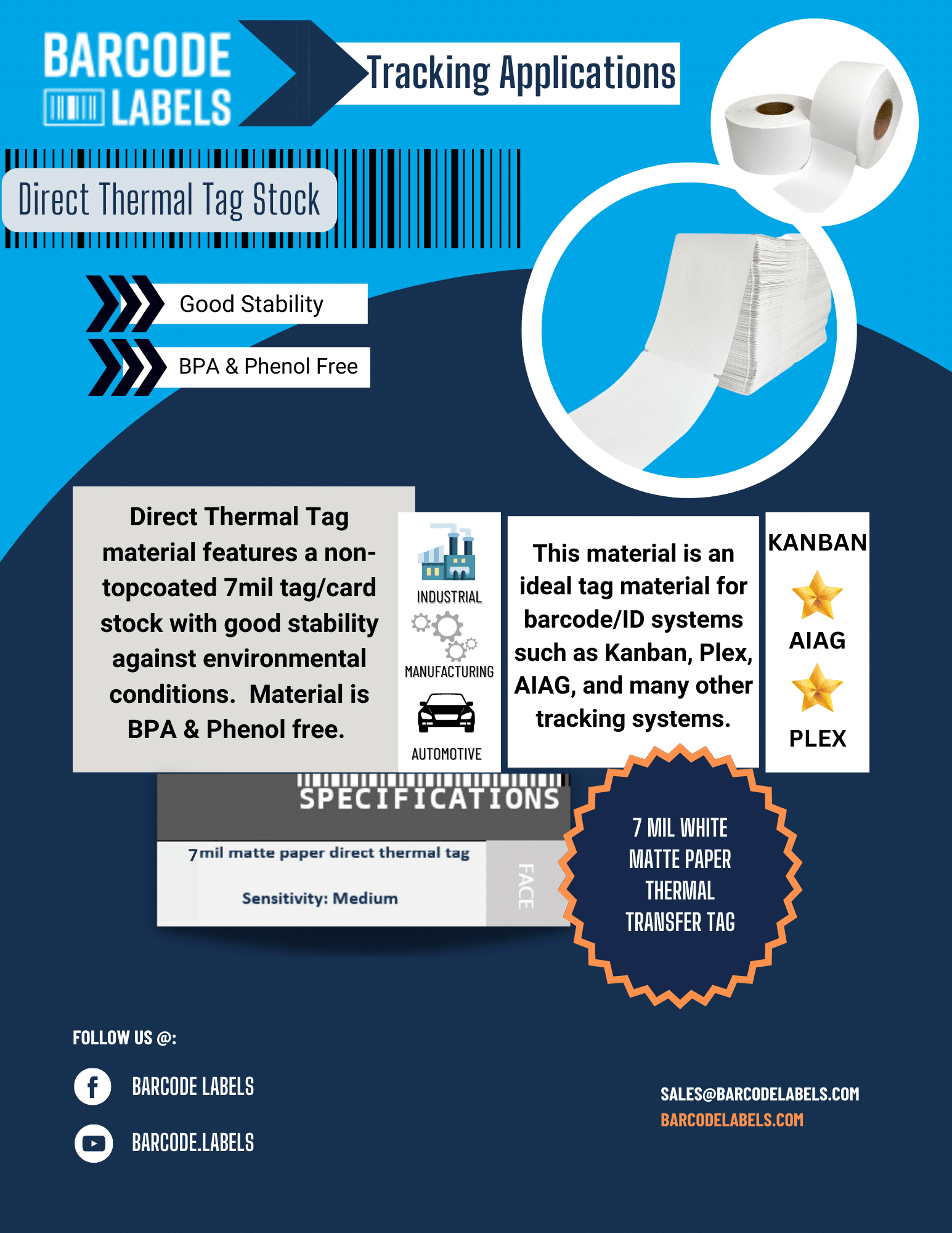 Direct Thermal Tags (DTT) are a great solution for the Kanban System. Compatible with AIAG, Plex, Kanban, and many other platforms used in automotive, healthcare, pharmaceutical, shipping/receiving, packaging, returnable containers, and other identification methods. Notched on both sides for printer compatibility. This product is an adhesive-free tag/card stock with BPA and Phenol-free material.